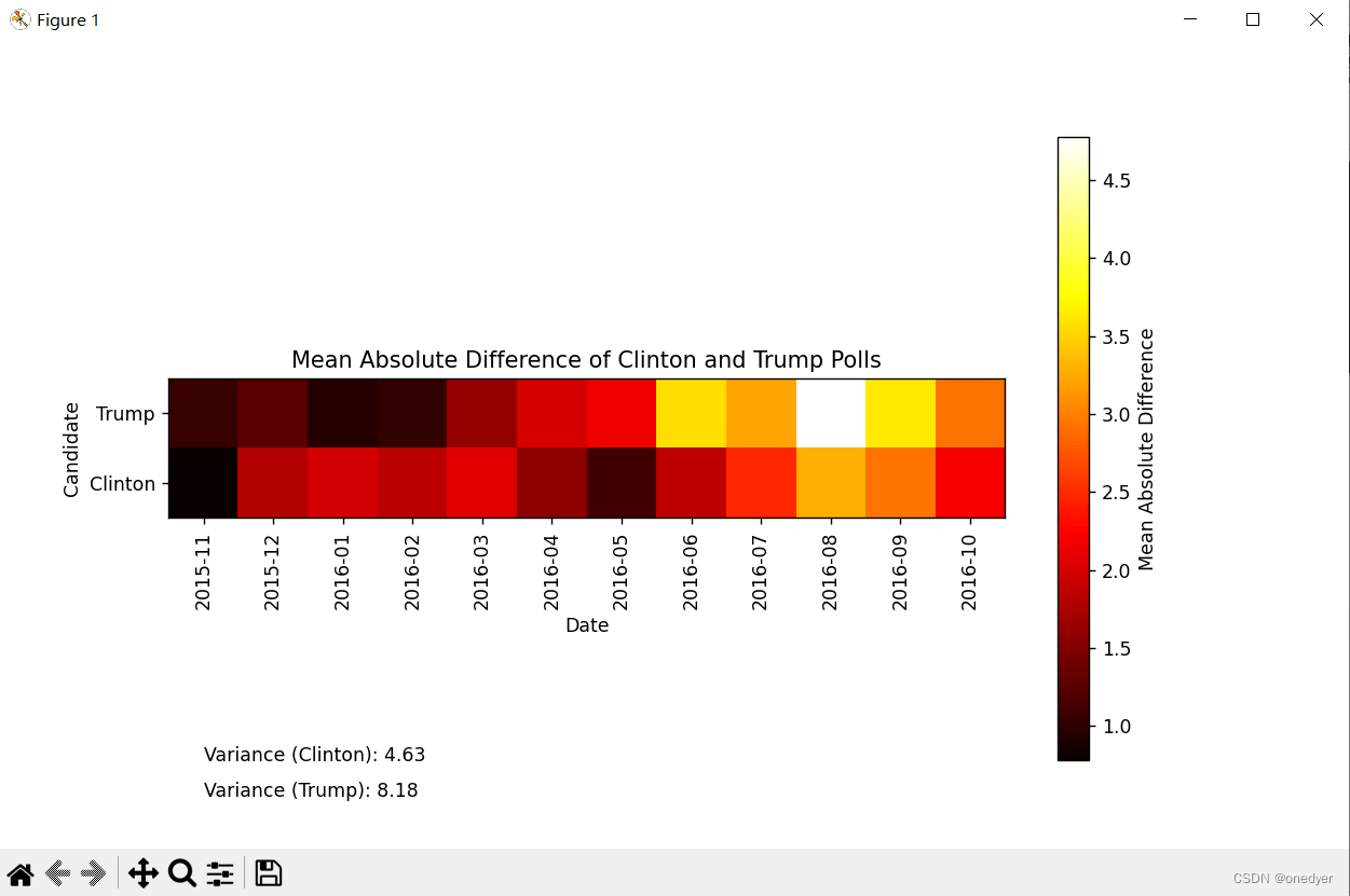 利用2016年美国总统大选数据,选择克林顿和特朗普的数据进行分析,根据每月的平均预测数据与真实数据的平均值之差的绝对值生成热力图,并比较二人的预测偏差大小。