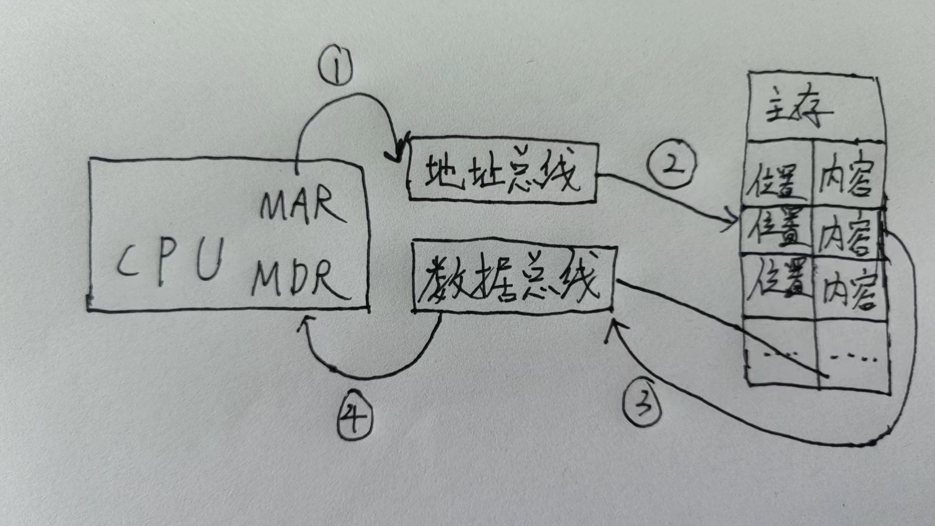 读操作:CPU首先获取要读取的数据的地址,并将这个地址存入自己的MAR中。然后,通过地址总线将MAR中存储的地址传送到主存储器中,主存储器根据这个地址找到对应的数据,并通过数据总线将数据传送到CPU的MDR中。