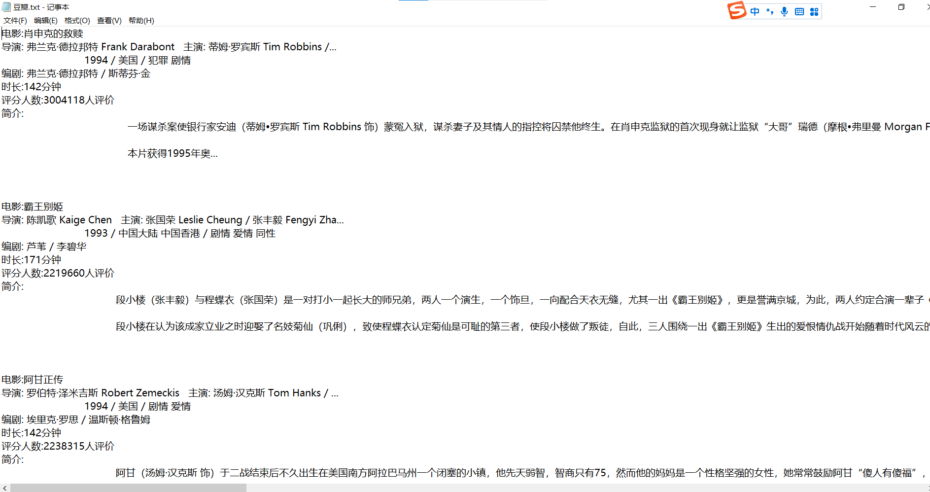 获取每部电影的导演、编剧、主演、类型、上映时间、片长、评分人数以及剧情简介等信息,并将获取到的信息保存至本地文件中。