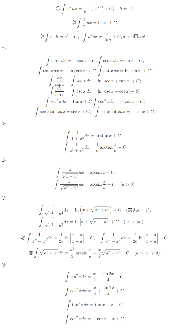 ②性质2(积分的线性性质):设$k_1, k_2$为常数,则$\int [k_1f(x)\pm k_2g(x)]dx=k_1\int f(x)dx \pm k_2\int g(x)dx.$