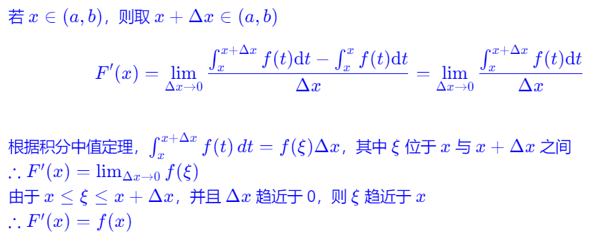 (2) 若函数f(x)在[a,b]上连续,则函数$F(x)=\int_{a}^{x}f(t)dt$在[a,b]上可导。