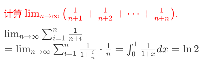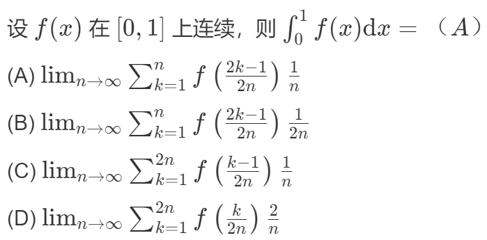$$\int_{0}^{1}f(x)\mathrm{d}x=\lim_{n\to\infty}\sum_{i=1}^{n}f\left(\frac{i}{n}\right)\frac{1}{n}$$