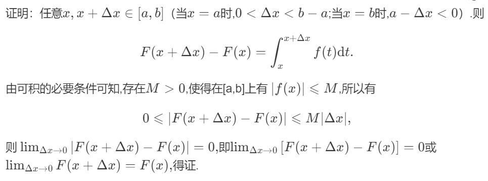 (1) 若函数f(x)在[a,b]上可积,则函数$F(x)=\int_{a}^{x}f(t)dt$在[a,b]上连续。