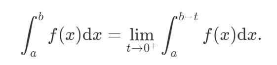若上述极限存在,则称反常积分 $\int_{a}^{b} f(x)\mathrm{d}x$ 收敛,否则称为发散。