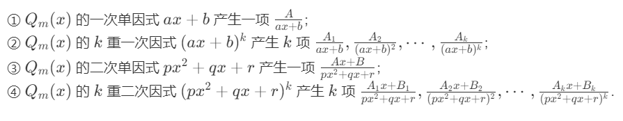 (2) 方法:先将 (Q_m(x)) 因式分解,再把 $\frac{P_n(x)}{Q_m(x)}$ 拆成若干项最简有理分式之和。